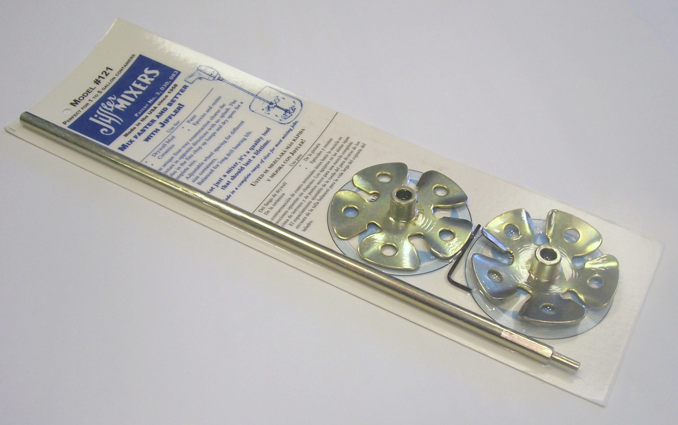 Made of plated steel, 3-1/2"wheels - adjustable on 3/8"x 16"shaft, milled for 1/4"or larger chuck on portable or stationary power of 1000 plus r.p.m. depeding on container/dia. and viscosity of material.